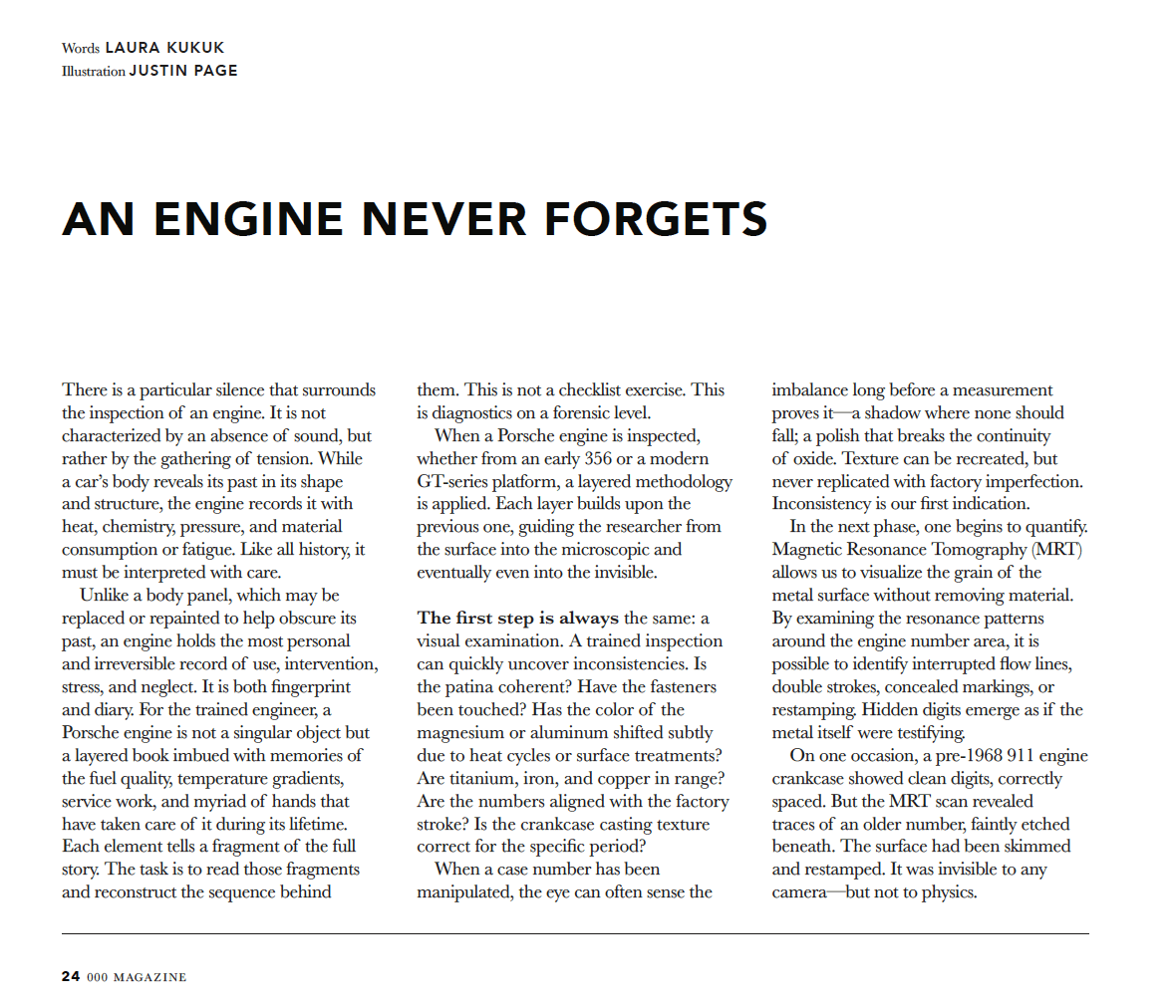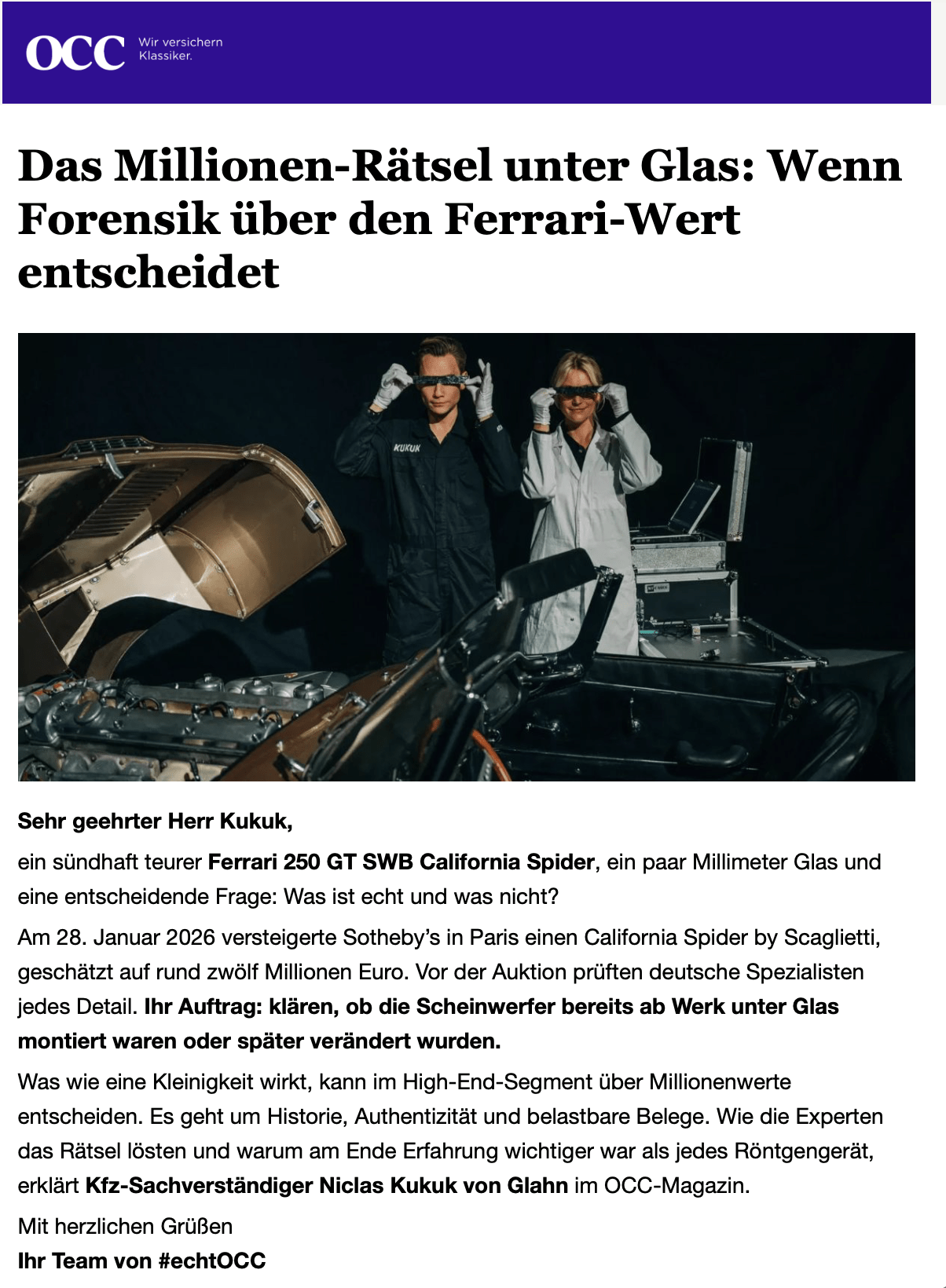 Über Interviews und Medienberichte hinaus bringt sich Kukuk Ingenieure aktiv mit redaktioneller Expertise ein. In regelmäßigen Kolumnen für 000 Magazine und Porsche Klassik liefern wir fundierte Marktanalysen, forensische technische Einordnungen und kritische Perspektiven auf Wertentwicklungen, Authentizitätsrisiken und strukturelle Veränderungen im Sammlermarkt. Diese Beiträge verstehen sich nicht als Meinung, sondern als analytischer Beitrag zur sachlichen Diskussion innerhalb der Branche.